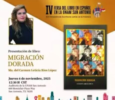📘 Presentación Especial – Migración Dorada Autora: Ma. del Carmen Leticia Ríos López (Lety Ríos) 📅 Jueves 6 de noviembre, 12:30 p.m.📍 600 Hemisfair Ave., San Antonio, TX 🎓 Dentro del marco de la Feria del Libro de la UNAM 2025: Letras sin Frontera ✨ Una narrativa que invita a la reflexión sobre la migración…